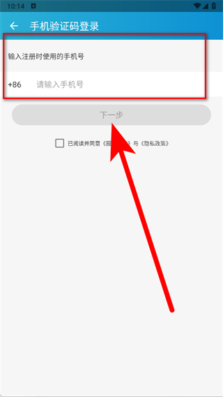 3、在手机验证码登录页,输入注册用的手机号,勾选同意条款后,点下一步。