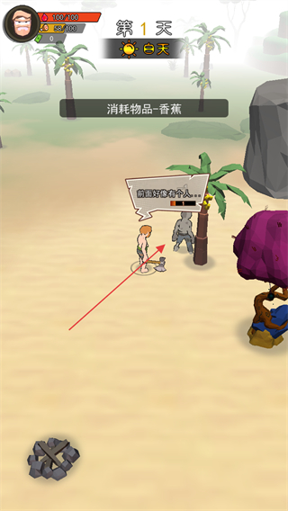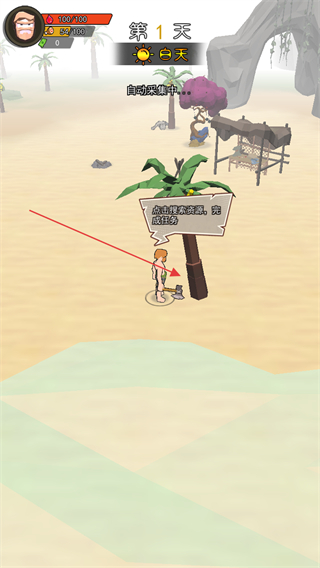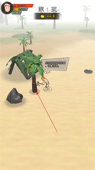 1、游戏初始在第1天,白天,点击棕榈树,根据提示点击挂机自动砍树,收集资源获取物资。