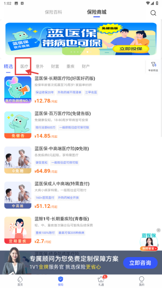 2、在保险商城页面,点击医疗分类标签,筛选医疗类保险产品。