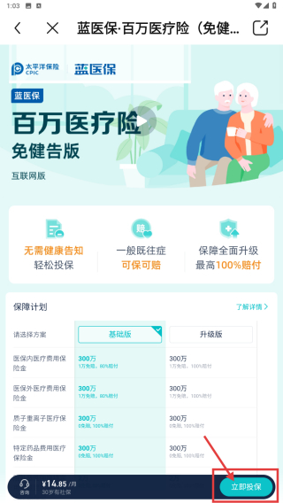 3、在医疗类保险产品列表中,选择蓝医保·百万医疗险免健告版产品,点击进入详情页。