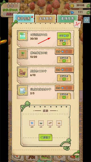 1、完成每日任务、主线任务和支线任务,领取钻石、材料等奖励,助力农场发展。