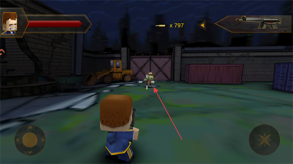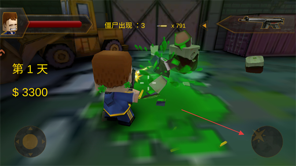 3、当僵尸出现时,点击屏幕右下方的射击按钮,使用武器如初始的枪攻击僵尸。