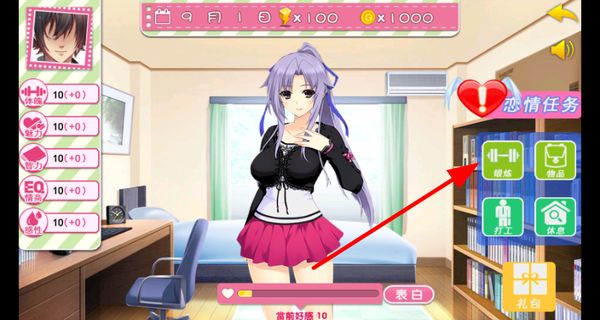3、可以点击锻炼等选项提升自身属性,让自己女友更具魅力,同时还有恋情任务可以参与。