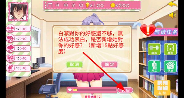 4、与心仪对象互动,当好感度足够时可尝试表白,若好感度不足,可选择新增好感度后再表白。