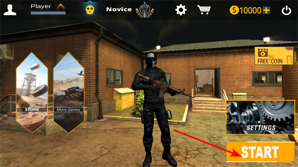 1、游戏用红色箭头指START按钮,提示玩家点击开始游戏。通过这一步,玩家正式进入游戏的战斗体系,开启反恐作战之旅。