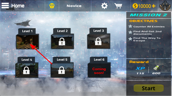 2、进入关卡选择界面后,红色箭头指向Level 1,说明这是玩家可参与的第一个关卡。玩家由此了解游戏的关卡解锁机制。