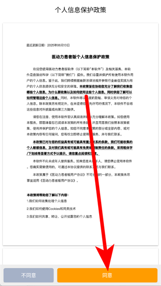 1、打开医动力患者版,在弹出的个人信息保护政策页面点击同意。