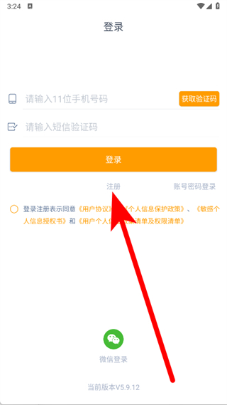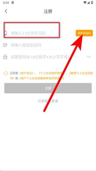 3、在注册页面,输入11位手机号码,点击获取验证码。
