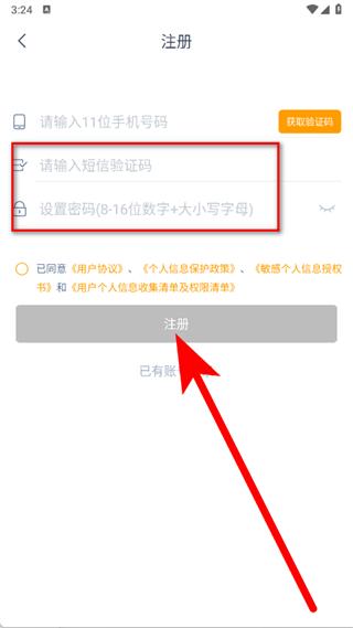 4、输入收到的短信验证码,设置符合要求的密码,勾选后,点击注册,完成注册。