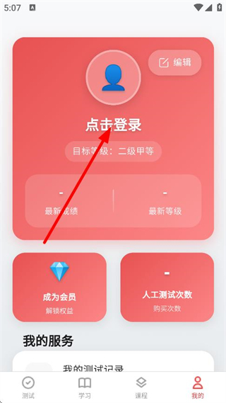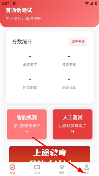 1、在普通话测试类APP测试页面,点击底部我的,进入个人中心页面。