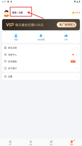 2、在个人中心页面,点击登录/注册选项,进入登录界面。