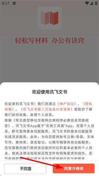 1、在欢迎使用讯飞文书弹窗中,点击同意并继续,进入首页。