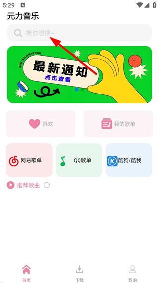 1、在元力音乐首页,点击顶部搜索框,进入搜索页面。