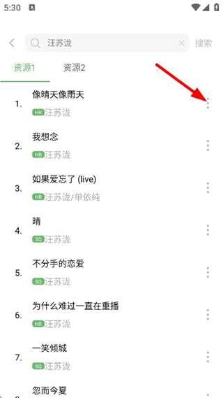 3、在搜索结果页面,点击歌曲右侧···,弹出操作选项。
