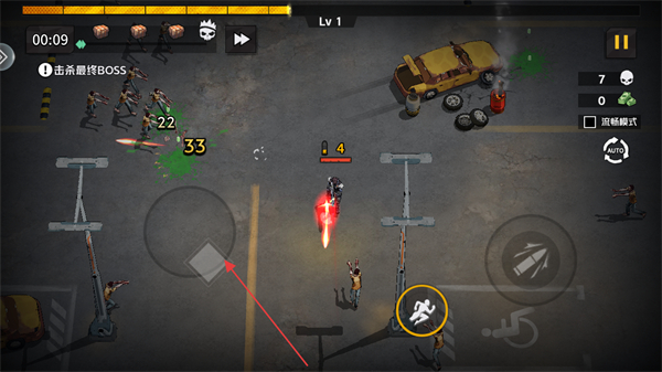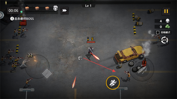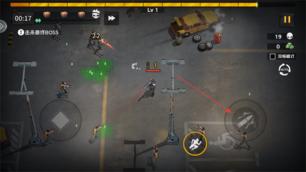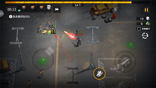 1、进入游戏,明确当前等级为Lv1以及关卡目标击杀最终BOSS,通过左下方虚拟摇杆操控角色移动走位。