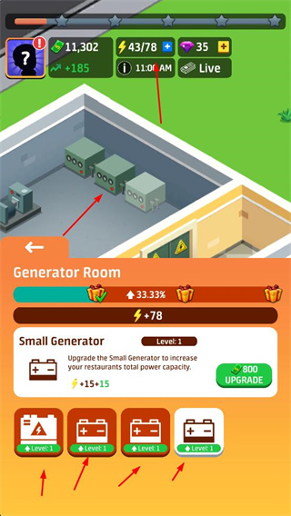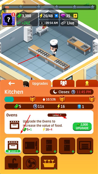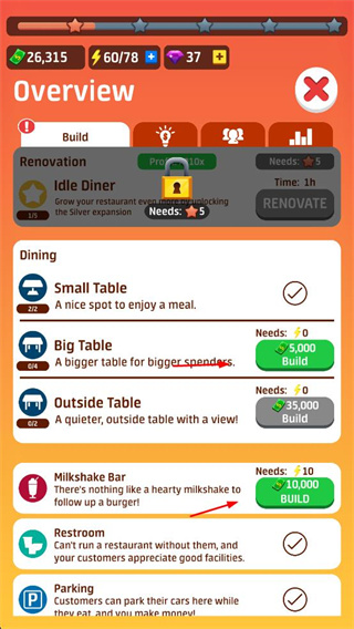 可使用经营收益解锁桌椅、装饰、厨房设备等,根据空间布局进行翻新,打造更舒适的用餐环境,提升食客进店意愿,同时改善厨房工作条件,提高烹饪效率。