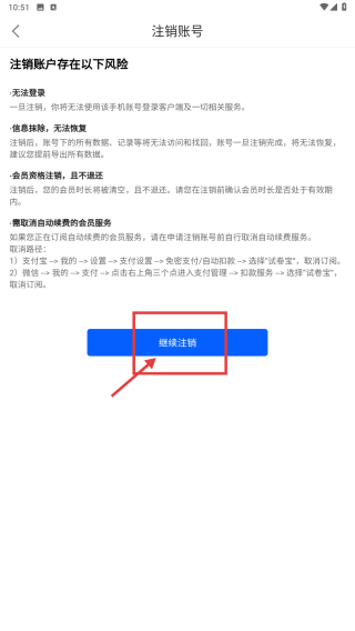 4、在注销账号风险提示页面,阅读并确认注销后存在的风险,点击继续注销按钮,按照提示完成账号注销操作。
