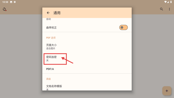 4、在通用设置界面,点击密码加密选项,可根据需求开启或调整文档的密码加密功能,以保障文档的安全性。