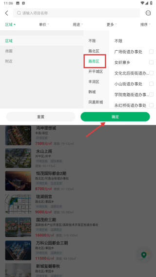 3、在区域筛选菜单中,选择路南区,然后点击确定按钮,完成区域筛选。
