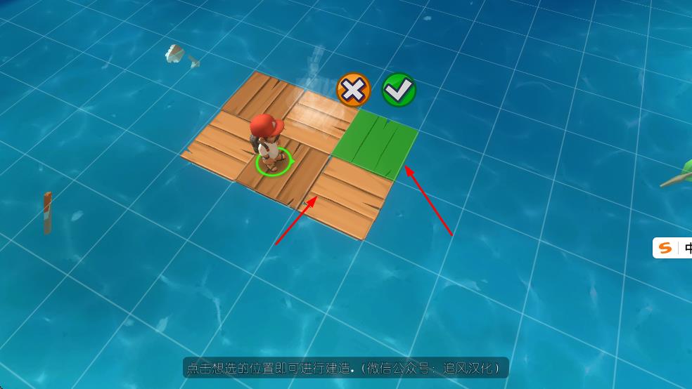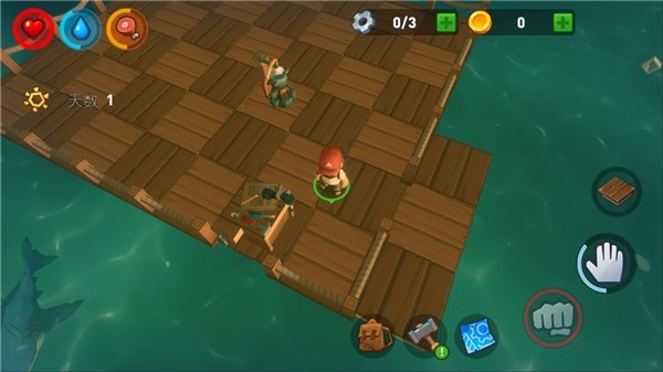 1、在木筏上点击合适位置进行建造,扩展木筏面积,为生存提供更多空间。
