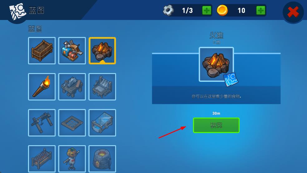 2、在蓝图中研究设施,消耗资源解锁制作配方,提升生存能力。