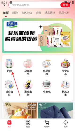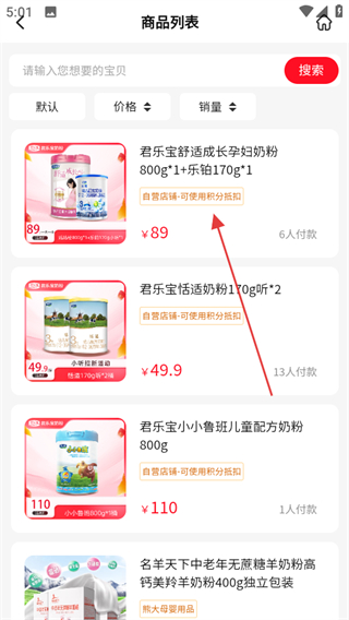 2、在积分商城页面,点击奶粉分类,进入奶粉商品列表页面。