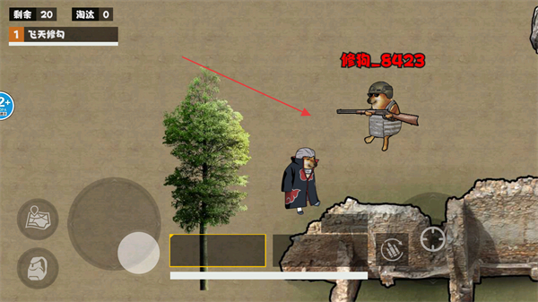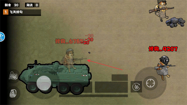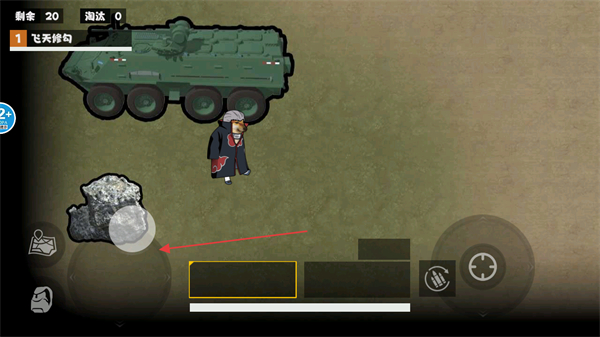 1、进入游戏,查看左上角剩余和淘汰人数,利用左下方虚拟摇杆控制载具或角色移动,躲避敌人攻击。