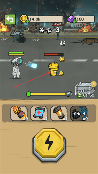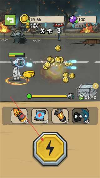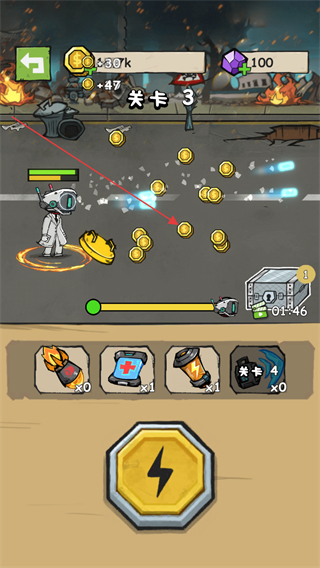 1、进入关卡3,点击下方闪电按钮释放技能,攻击敌人并收集金币。