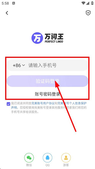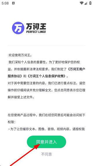 1、在万词王的欢迎页面,点击同意并进入,进入登录页面。