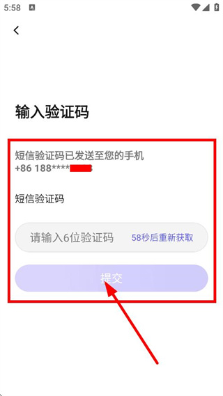 3、在验证码输入页面,输入收到的6位验证码后,点击提交,完成账号登录。