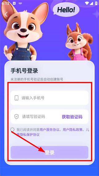 3、在手机号登录页面,输入手机号、验证码,点击登录,完成账号登录。