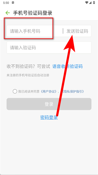 3、想验证码登录页面,输入框中填写手机号,点击发送验证码按钮。