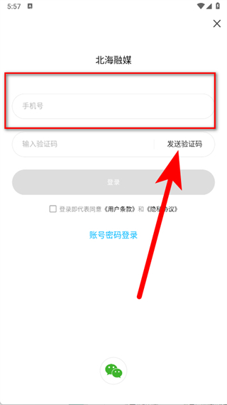 3、在登录页面,输入手机号码,点击发送验证码。