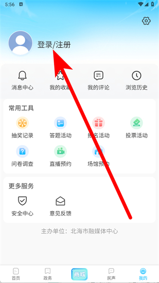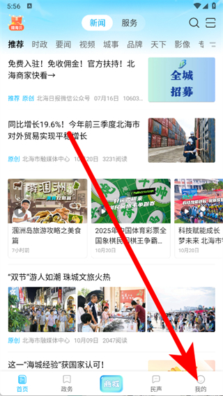 1、打开北海融媒,点击底部导航栏最右侧的我的。