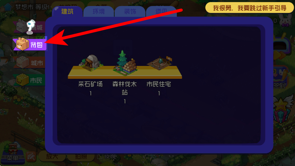 1、进入游戏先创建市长形象与城市名称,跟随新手引导了解基本操作,通过背包里的建筑道具,如采石矿场、森林伐木站、市民住宅等,点击放置到合适区域完成建造。