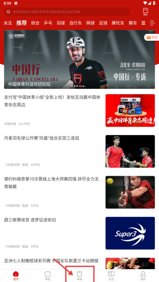 1、打开体育类应用,点击底部商城选项,进入商城页面。