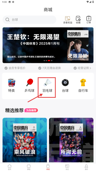 2、在商城页面,点击羽毛球分类,进入羽毛球商品列表。