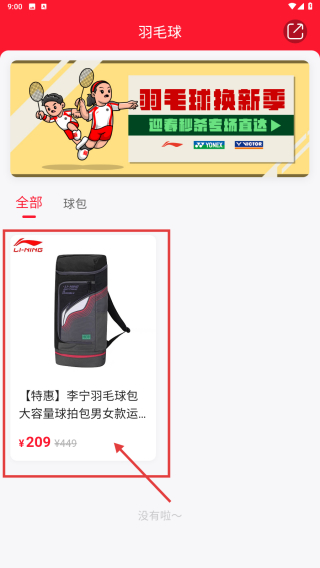 3、在羽毛球商品列表中,选择特惠李宁羽毛球包大容量球拍包男女款运动双肩背包ABSS079商品,点击进入商品详情页面。