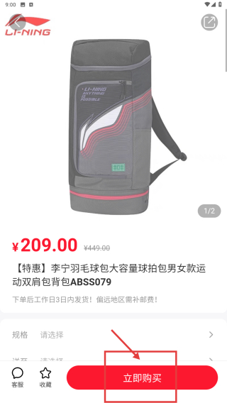 4、在商品详情页面,点击立即购买按钮,即可进行该羽毛球包的购买操作,该商品价格为¥209.00,下单后工作日3日内发货,偏远地区需补邮费。
