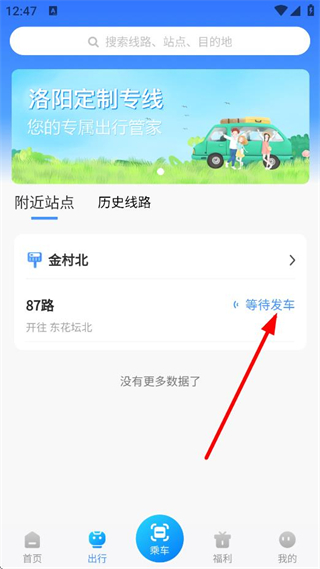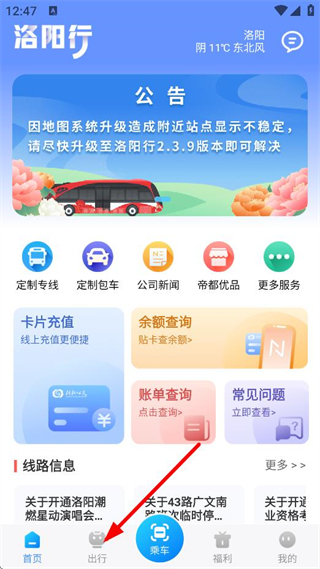 1、在洛阳行的主页面,点击底部的出行,进入出行页面。