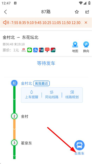 3、在公交路线详情页面,点击去乘车,可进行该公交的乘车操作。