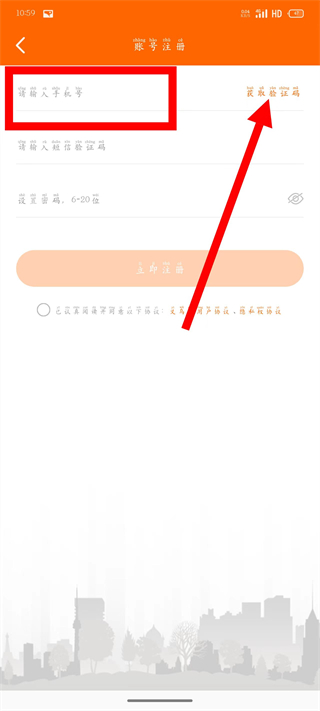 4、在注册页面,输入手机号码,点击获取验证码按钮。