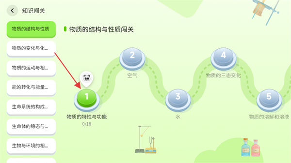 2、在知识闯关板块,点击1物质的特性与功能可进入对应闯关内容页面。