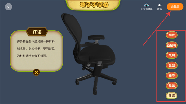 4、在知识点页面学习椅子的各个零件的知识,学习完后点击去答题可进入答题环节。
