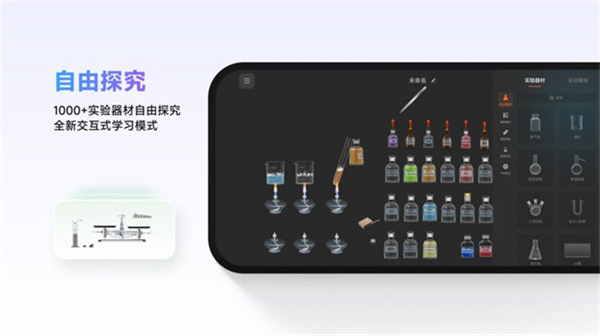 无需实体器材与场地,通过手机即可完成实验操作,规避了化学药品危险、物理器材损耗等问题,同时支持反复操作,让学生大胆尝试不同实验步骤。
