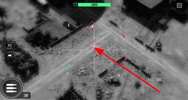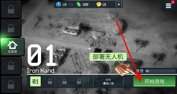 1、主菜单界面点击开始游戏进入对应关卡,部署无人机后开展军事射击任务,在不同场景中逐步推进游戏进程。