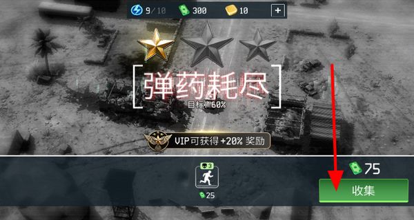 3、弹药耗尽关卡结束,可以点击收集钞票的按钮获取资源,及时补充弹药或用于武器升级等战斗准备再次挑战。