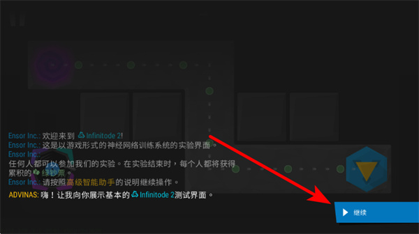 1、点击继续按钮,推进游戏教程或实验流程,了解游戏的神经训练系统机制,开启正式游戏环节。