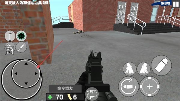 1、通过左侧虚拟摇杆控制角色移动,在场景中寻找并瞄准敌人。