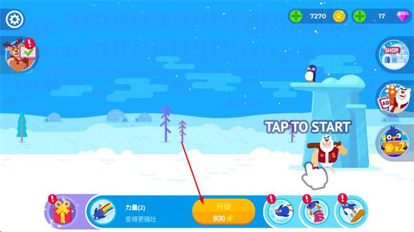 1、点击TAP TO START开启游戏,,花费金币升级力量属性,让角色变得更强。